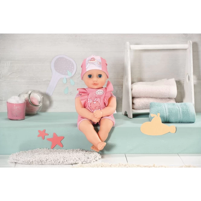 Blubb, blubb… einfach mal entspannt in der Wanne abtauchen wie das Schäfchen auf ihrem Badeanzug, das ist die Lieblingsbeschäftigung der kleinen Annabell. Der Körper der 30cm großen Puppe ist aus Stoff und mit Granulat gefüllt. Ihre Beine, die Arme und der Kopf sind aus softem Vinyl. Der rosa Swimsuit ist gleichzeitig der Körper der süßen Bademeisterin. Er ist mit Wasser-Blauen Abnähern verziert und durch die Rüschen auf der Vorderseite sieht es fast so aus, als ob Annabell zwischen Wasserpflanzen hindurch schwimmt. Auch das Schaf auf der Badekappe hat sich schon mit Schwimmreifen und Wasserball ins spritzige Nass begeben.